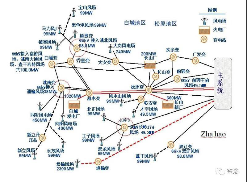 下面兩張圖是早期的新能源場站接入電網(wǎng)的示意圖,大體可以看出,早期投運的新能源電站大多位于電網(wǎng)末端,開發(fā)相對集中,往往是多個電站連片匯集接入到電網(wǎng)。