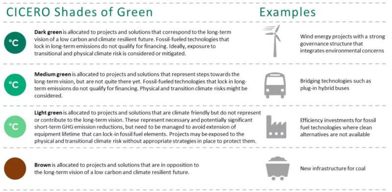 這一框架已被獨立審查機構(gòu)(挪威CICERO Shades of Green)授予最高綠色等級的主權(quán)債券(“深綠”)。CICERO Shades of Green跟據(jù)投資項目對氣候、環(huán)境的影響綠色債券分為深綠、中綠、淺綠三種,為投資者提供透明度。