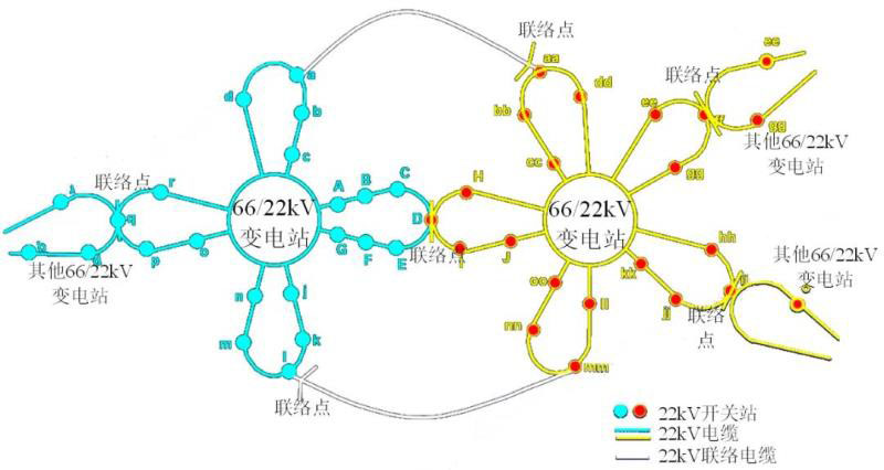 新加坡單花瓣接線全線開(kāi)關(guān)站配置、閉環(huán)運(yùn)行,且站間存在聯(lián)絡(luò),但調(diào)整站間負(fù)荷須打破花瓣閉環(huán)運(yùn)行,站間負(fù)荷轉(zhuǎn)供靈活性不足。