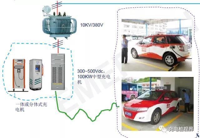 企業(yè)建設(shè)的城市綜合充電解決方案的變配電設(shè)施,宜選用10kV電力接入箱式變電站的變電、配電、充電集成一體化設(shè)備。充電設(shè)施采用模塊化設(shè)計,一套充電設(shè)施設(shè)備可同時滿足10輛電動公交車充電(可滿足2~4輛電動公交車同時快充或10輛電動公交車慢充)、25輛出租車同時快充和40多輛私家車同時慢充。