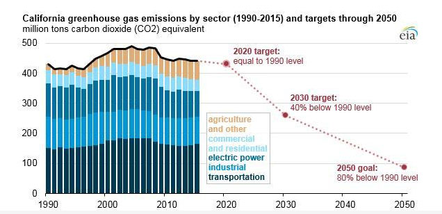 2017年,加州政府頒布州法AB 398,提出了美國(guó)最激進(jìn)的減排目標(biāo);計(jì)劃到2030年將溫室氣體排放量在1990年水平上減少40%,到2050年實(shí)現(xiàn)溫室氣體比1990年減少80%。這意味著加州2030年二氧化碳排放量將從2017年的4.24億噸急劇減少到2.58億噸。