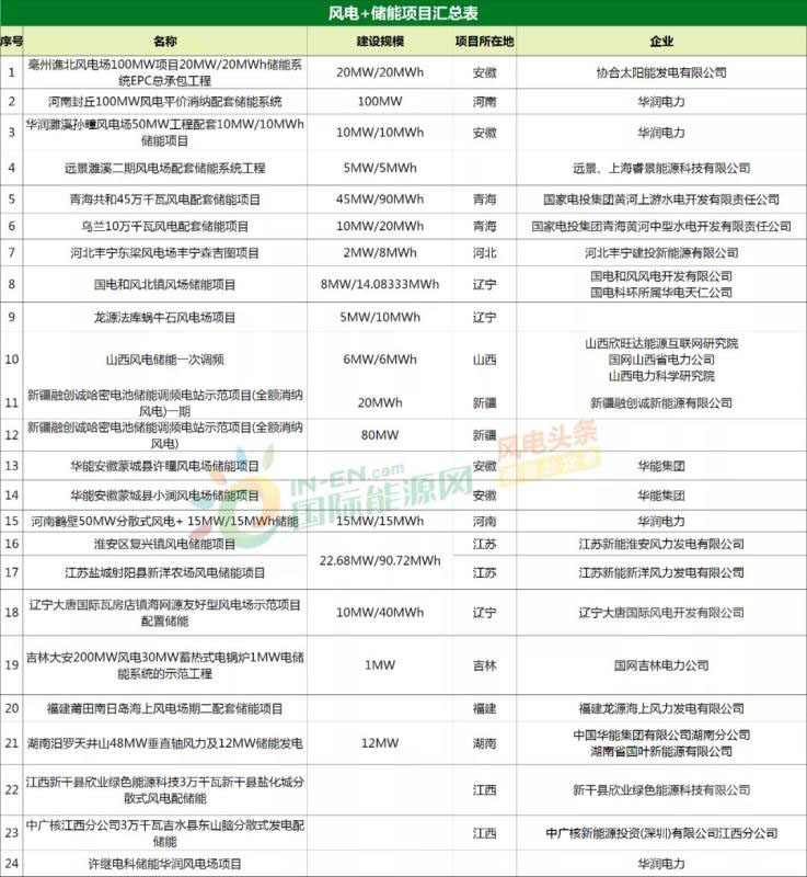 表中省份除了對新建的風(fēng)電項目要求配置儲能設(shè)備之外,山西省對35KV以上的光伏電站(已建好)要求進(jìn)行一次調(diào)峰改造,更被視為風(fēng)光儲配置擴大化的表現(xiàn)。同時,國際能源網(wǎng)/風(fēng)電頭條(微信號:wind-2005s)還對目前已經(jīng)見諸報端的風(fēng)電+儲能項目進(jìn)行了簡單的統(tǒng)計。