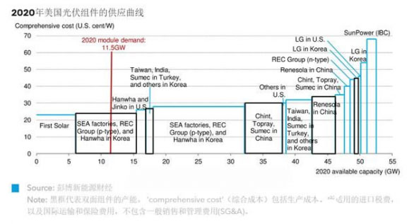 BNEF預(yù)計(jì)2020年可供應(yīng)美國(guó)市場(chǎng)的雙面組件產(chǎn)能將達(dá)到20.5GW,其中9.4GW的雙面組件平均生產(chǎn)成本為22美分/瓦。大型廠商今年下半年可將組件生產(chǎn)成本壓低至18美分/瓦。由于普遍性供過(guò)于求,在豁免關(guān)稅的情況下,雙面組件價(jià)格有可能降至23美分/瓦,這個(gè)價(jià)格在涵蓋所有非生產(chǎn)性支出的情況下,可保證4%的凈利潤(rùn)率。