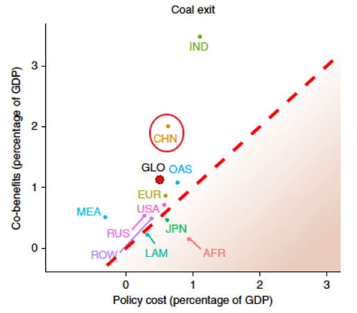 言歸正傳,《自然-氣候變化》這篇文章其實(shí)說(shuō)的是各國(guó)“退煤”(煤炭退出歷史舞臺(tái))的這一選擇總體來(lái)說(shuō)會(huì)利大于弊;英文輿論世界里把這篇文章總結(jié)為“退煤”是世界的一種無(wú)悔選擇(no-regret strategy)。文章中這個(gè)利主要指減少煤炭燃燒帶來(lái)的健康收益和環(huán)境收益,弊主要指使用替代性高價(jià)清潔能源帶來(lái)的消費(fèi)損失。