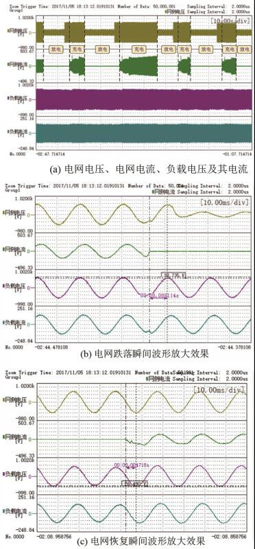 在UPS充滿電后,頻繁手動拉閘與合閘電網(wǎng),以檢驗UPS應(yīng)對電網(wǎng)連續(xù)故障的性能。實驗中設(shè)定UPS充電功率為85 kW,負(fù)載功率為50 kW,每次電網(wǎng)恢復(fù)到額定值后,經(jīng)過2.5 s飛輪開始充電。實驗結(jié)果如圖11所示。由于控制柜轉(zhuǎn)換開關(guān)處有漏壓,導(dǎo)致圖11(a)中網(wǎng)側(cè)電壓拉閘后電壓不為0。