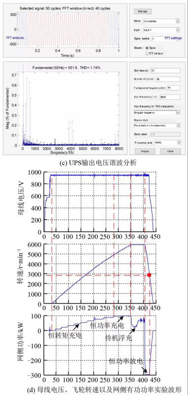 從圖11(a)看出,UPS能夠及時應(yīng)對電網(wǎng)頻繁故障,負(fù)載電壓基本不受電網(wǎng)斷電影響。由于負(fù)載功率降低至50 kW,負(fù)載電壓恢復(fù)時間縮短至8 ms。以上結(jié)果表明UPS具有良好的快速響應(yīng)性能,進(jìn)一步證明了準(zhǔn)PR方法的有效性以及飛輪充放電控制策略的有效性。