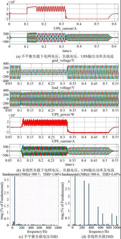 圖9(b)和(d)為非線性負(fù)載下的仿真結(jié)果,負(fù)載為三相不控整流電路,其直流側(cè)接1.46 Ω電阻。從結(jié)果可以看出,UPS輸出功率和電流波動頻率高且不正弦,這是由負(fù)載非線性造成的;負(fù)載電壓在電網(wǎng)供電與UPS供電兩種情況下波形基本沒有差別,UPS輸出電壓波形THD為6.43%,諧波主要集中在基頻的5次和7次,這說明UPS具有良好的帶非線性負(fù)載能力。