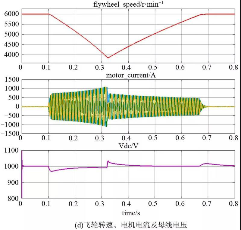 仿真過程中,飛輪工作在設(shè)定轉(zhuǎn)速范圍內(nèi),并以恒功率的方式進(jìn)行充電和放電;電機電流正弦且光滑,諧波較??;母線電壓保持穩(wěn)定,最大波動幅值小于3%。這驗證了充放電控制方法的有效性。