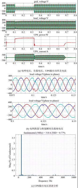 負(fù)載為三相對稱電阻,均為0.48 Ω,功率為300 kW,仿真結(jié)果如圖8所示。在電網(wǎng)電壓跌落后,負(fù)載電壓在6 ms內(nèi)恢復(fù)到了跌落前的0.9 p.u.,而且前后的相位保持不變;對UPS輸出電壓進(jìn)行諧波分析,如圖8(c),THD值為1.73%。以上結(jié)果證明了準(zhǔn)PR方法在UPS輸出電壓暫態(tài)性和穩(wěn)態(tài)性方面的良好作用。