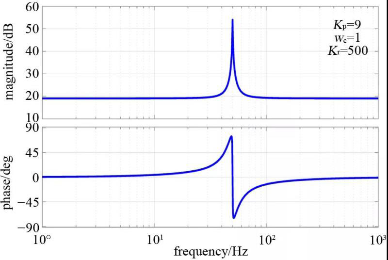 式中,Kp為比例增益;ωc為控制器帶寬;Kr為諧振頻率處增益;ω0為諧振頻率,此處為50 Hz。為使準(zhǔn)PR控制器發(fā)揮良好的跟蹤性能,需要合理調(diào)節(jié)前三個參數(shù):Kp用以提高快速性能,在斷電瞬間迅速做出反應(yīng);ωc用以限制頻率調(diào)節(jié)范圍,此處設(shè)置為40~50 Hz;Kr用以提高快速性能以及穩(wěn)態(tài)性能,其越大穩(wěn)態(tài)誤差越小,但同時穩(wěn)定性變差。本文針對輸出工頻電壓控制,設(shè)計準(zhǔn)PR控制器參數(shù)分別為:Kp=9,ωc=1,Kr=500,傳遞函數(shù)的波特圖如圖7所示。從幅頻特性看,在40~60 Hz頻域內(nèi),系統(tǒng)增益較大,在50 Hz處達(dá)到極點,在此頻域范圍外,增益比較小,這有利于減小穩(wěn)態(tài)誤差和提高抗干擾能力。
