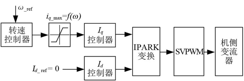 在機側(cè)控制中,采用id=0的控制方式,電流iq決定了電機的運行狀態(tài)。在充電時,電機給定轉(zhuǎn)速為ω_ref = ωmax。為了實現(xiàn)恒轉(zhuǎn)矩與恒功率控制,在轉(zhuǎn)速控制器輸出側(cè)對電流進(jìn)行限幅。恒轉(zhuǎn)矩升速時,以機側(cè)額定電流進(jìn)行充電;恒功率升速時,以負(fù)載最大有功功率進(jìn)行充電,因此限幅函數(shù)為