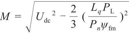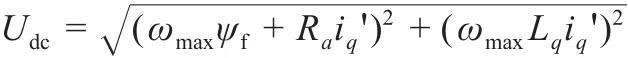 本文采用空間矢量調(diào)制方法,變流器輸出線電壓幅值最大為母線電壓Udc。因此可建立方程