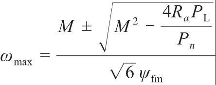 電機升速時,最高轉(zhuǎn)速設(shè)定條件有兩個:一是電機端電壓等于機側(cè)變流器最大線性調(diào)制輸出的線電壓,二是電機輸出有功功率滿足負(fù)載有功需求。
