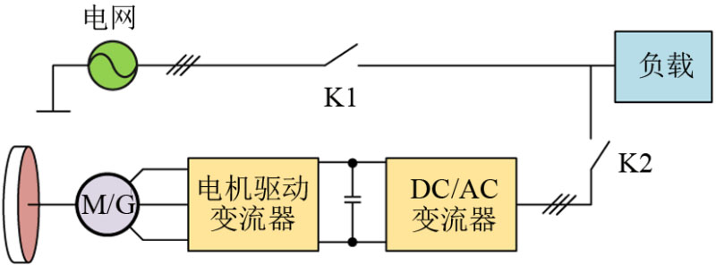 文獻(xiàn)[3]系統(tǒng)地梳理了蓄電池UPS的拓?fù)浞诸?,即在線雙變換式、在線交互式和后備式三種,并分析了各拓?fù)涞倪\行機制以及動態(tài)性能。閥控式蓄電池具有能量密度大、技術(shù)成熟等優(yōu)點,目前在UPS系統(tǒng)中應(yīng)用最為普遍,但是其缺點在于充電時間長、平均無故障時間短、環(huán)境不友好等,而且使用壽命為僅5年左右。飛輪儲能技術(shù)是一種清潔環(huán)保技術(shù),借助于磁懸浮技術(shù)和電力電子技術(shù)的發(fā)展,飛輪儲能單元具有效率高、維護(hù)成本低、可頻繁充放電等優(yōu)勢,而且使用壽命可達(dá)20年,可較為理想地替換蓄電池。近幾年國外的Vycon、Active Power、盾石磁能科技有限責(zé)任公司等公司開發(fā)的飛輪儲能UPS已成功應(yīng)用于軌道交通和微電網(wǎng)等領(lǐng)域,國內(nèi)的高校和公司在飛輪儲能領(lǐng)域也做了很多研究。然而,大部分的產(chǎn)品和研究主要集中于在線式拓?fù)?,如Vycon公司VDC系列產(chǎn)品和文獻(xiàn)采用背靠背變流器為負(fù)載供電,飛輪控制器的直流側(cè)與背靠背變流器的直流母線連接,這種拓?fù)涔╇娰|(zhì)量比較高,而可靠性和效率相對較低;Active Power公司開發(fā)的CLEAN SOURCE系列產(chǎn)品采用并聯(lián)在線式拓?fù)?,提高了可靠性和效率,但是結(jié)構(gòu)相對復(fù)雜。