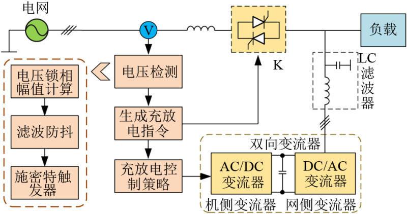 本工作在當(dāng)前飛輪儲能UPS拓?fù)浼翱刂撇呗缘难芯炕A(chǔ)上,提出了新型后備式飛輪儲能UPS及其控制策略。該系統(tǒng)利用可控硅開關(guān)和準(zhǔn)比例諧振(quasi-PR)控制方法為負(fù)載提供快速、高質(zhì)量電力供應(yīng),簡化了拓?fù)浣Y(jié)構(gòu)的同時提高了系統(tǒng)可靠性和效率。本工作給出了充、放電過程中雙向變流器的控制策略以及正弦電壓輸出準(zhǔn)PR設(shè)計方法。最后通過仿真和實驗證明了該系統(tǒng)具有響應(yīng)快、供電質(zhì)量高的特點。