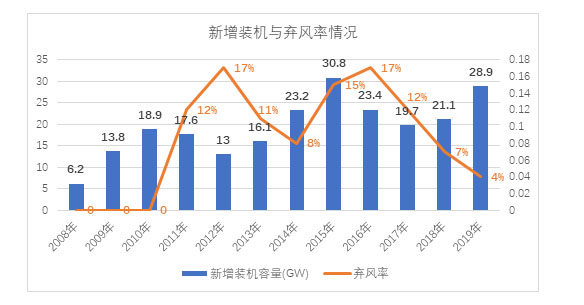 如果結(jié)合裝機(jī)量和棄風(fēng)率可以發(fā)現(xiàn),風(fēng)電裝機(jī)在棄風(fēng)率減少時便會出現(xiàn)增長。究其原因,主要就是消納問題。