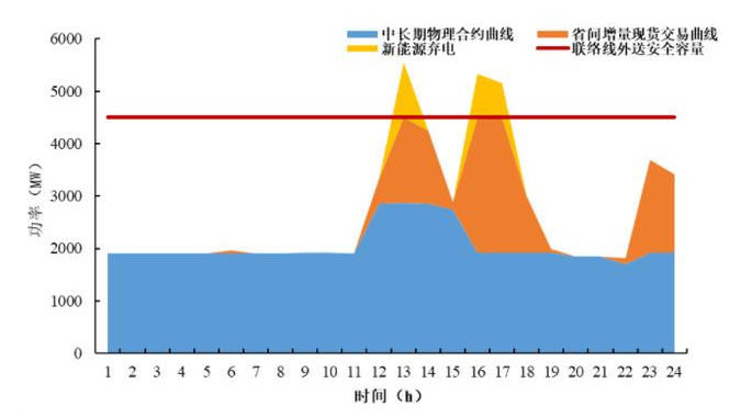 下圖展示了開展省間增量現(xiàn)貨市場后,某一天內(nèi)跨省區(qū)聯(lián)絡(luò)線上的輸送功率情況及送端省份新能源限電情況。