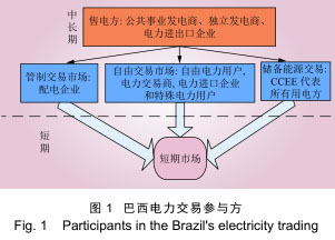 為兼顧電力普遍供應(yīng)及合理化電價水平,促進(jìn)電力行業(yè)投資和發(fā)展,巴西政府將電力買賣市場分為管制交易市場(Ambiente de Contrata??oRegulada, ACR)、自由交易市場(Ambiente deContrata??o Livre, ACL)和短期交易市場。其中,管制交易市場是主要組成部分,主要是確保絕大部分電力用戶特別是議價能力較低的中小企業(yè)和普通居民的用電需求得到滿足,市場交易多為長期合約,確保發(fā)電及用電雙方中長期供需的穩(wěn)定,這部分用戶數(shù)量較多,用電量也較大,市場份額約 70%。自由交易市場是重要組成部分,主要是通過市場競爭促使電力服務(wù)商在確保電能質(zhì)量的前提下降低成本,提升運營和服務(wù)效率,并促進(jìn)發(fā)電領(lǐng)域投資,主要以大企業(yè)用戶為主,市場份額 25%~30%。短期交易市場作為前兩個市場補(bǔ)充,以現(xiàn)貨合約為主,旨在保障電力供需平衡,市場份額約 5%。各參與方如圖 1 所示。
