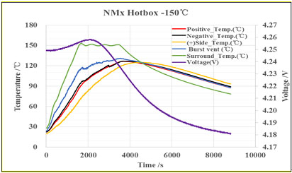 如電芯熱箱安全測(cè)試(見(jiàn)下圖),可以通過(guò)150℃,0.5h的嚴(yán)苛測(cè)試條件,而目前國(guó)標(biāo)(GB/T 31485-2015)的要求僅為130℃,0.5h。