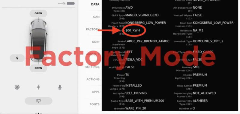 日前,另一名黑客“Zeus M3”在Twitter上表示,其進入了特斯拉的工廠模式(Factory Mode),并且發(fā)現(xiàn)了100 kWh電池容量版本的Model 3。他還在Twitter上發(fā)布了這個工廠模式的截圖: