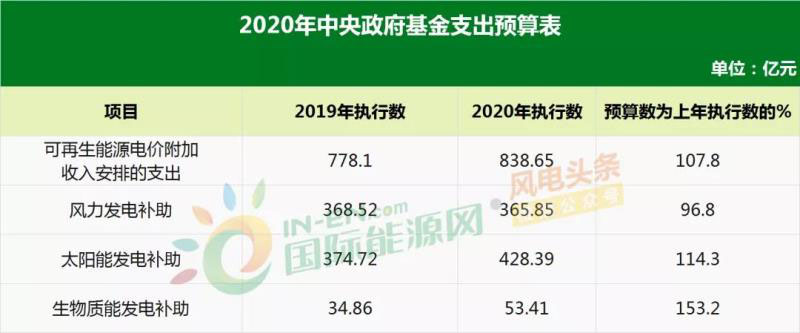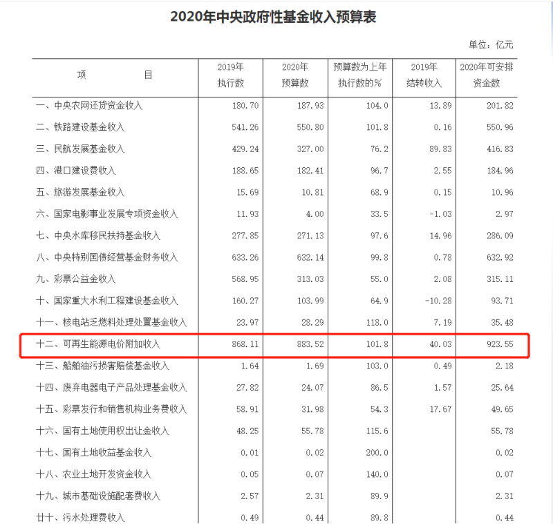 根據(jù)財政部公布的《2020年中央財政預算》,2020年可再生能源電價附加收入預算數(shù)為883.52億元,比2019年執(zhí)行數(shù)增加15.41億元,增長1.8%。主要根據(jù)社會用電量預計增長情況測算。