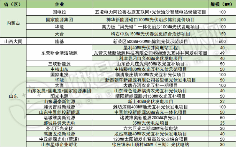 在2020年競價項目申報中,內蒙古共上報4個光伏儲能項目,山東上報的19個光伏項目皆配置儲能。項目業(yè)主依然離不開央企,包括國電投、國家能源集團、華能、三峽新能源、大唐、中核等,以隆基、天合、陽光電源代表的光伏民企也紛紛加碼光伏儲能項目。