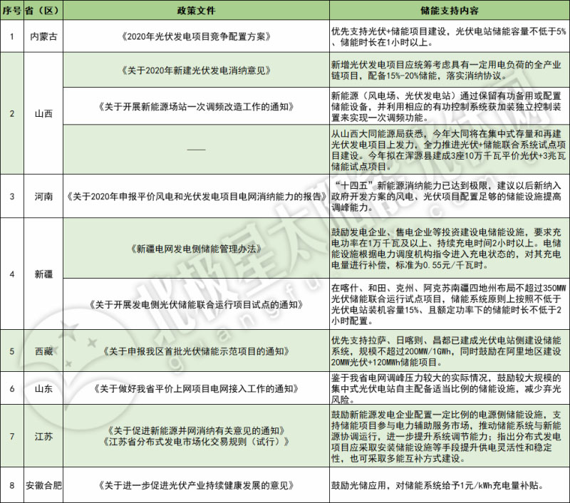 截至目前,內蒙古、山西、河南、新疆、西藏、山東、江蘇、安徽合肥等8地政府相繼發(fā)布政策,優(yōu)先支持和要求光伏電站加配儲能,以促進新能源消納,并增強調峰、調頻能力。