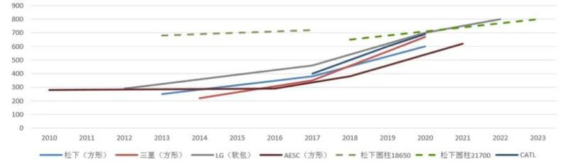 松下:松下與特斯拉深度綁定,最早采用鎳鈷鋁酸鋰(NCA)高鎳材料體系,主要以圓柱電池為主,目前產(chǎn)品由18650向21700轉(zhuǎn)變,并實現(xiàn)了供貨。目前電芯的能量密度已經(jīng)超過300Wh/kg,電池體系中采用了NCA和硅碳負(fù)極復(fù)合材料。另外松下?lián)碛蟹叫碗姵厣a(chǎn)能力,但是規(guī)模較小,主要產(chǎn)能在中國大連和日本Himeji。松下與豐田合作較為緊密,綁定也比較深,且計劃與豐田合作開發(fā)下一代固態(tài)鋰離子電池。