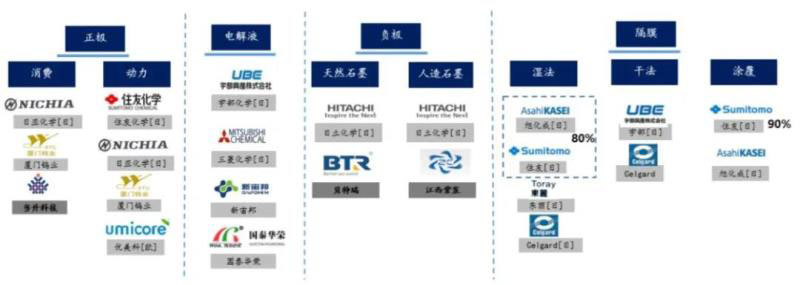LG化學(xué)利用傳統(tǒng)業(yè)務(wù)優(yōu)勢,正極材料基本上采用自產(chǎn)自用的模式,早些時間隔膜主要采用SK,隨著兩家公司因?qū)@m紛,LG化學(xué)隔膜供應(yīng)商發(fā)生了一些大的變化。2019年LG化學(xué)投資29億元人民幣在韓國建立電池正極材料工廠,另外在韓國其他地方擴建其正極材料產(chǎn)能,根據(jù)公開資料LG化學(xué)目標(biāo)是將正極材料內(nèi)部供應(yīng)率提高到40%以上。我們國內(nèi)當(dāng)升科技和上海杉杉科技供應(yīng)量比較小。除韓國本土的正極材料自供外,優(yōu)美科正極材料在LG化學(xué)中占比較高;負(fù)極材料方面LG化學(xué)供應(yīng)商初期的供應(yīng)商是三菱化學(xué)和日立化成,近幾年由于我國技術(shù)進步較快,也逐漸進入其供應(yīng)鏈,且份額逐年上升,尤其是璞泰來、杉杉股份已經(jīng)成為LG化學(xué)的負(fù)極材料的主要供應(yīng)商。LG化學(xué)的隔膜供應(yīng)商早期以旭化成、東麗、SK和 Celgard為主,目前國內(nèi)以星源材質(zhì)干法隔膜取代 Celgard干法隔膜,上海恩捷股份濕法隔膜在2019年進入其供應(yīng)鏈并獲得大額訂單,目前LG化學(xué)的隔膜供應(yīng)由中國企業(yè)主導(dǎo)。LG化學(xué)電解液仍然以三菱化學(xué)、日本宇部和江蘇國泰為主,近年來新宙邦、天賜材料、天津旭化成等進入其供應(yīng)鏈。