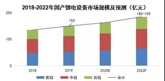 目前,國產(chǎn)用鋰電設(shè)備的國產(chǎn)化率已達到90%-92%。受新增產(chǎn)能帶動,到2022年,屬于國產(chǎn)鋰電設(shè)備的市場份額將達到180-190億元。