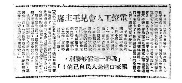 10月20日,工作隊員在楊家?guī)X終于見到了毛主席,毛主席聽完大家的匯報,笑著對大家說:“謝謝,謝謝!你們一路很辛苦,安不安電燈不要緊,煤油燈還是能辦事”,“請你們將來回去,替我感謝張家口的全體同志們,謝謝大家的好意”。