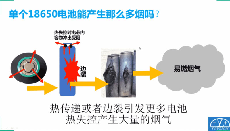 “一般單顆18650電芯發(fā)生熱失控,如果電芯內(nèi)容物沖出受阻就會(huì)產(chǎn)生邊裂,將導(dǎo)致更多電芯熱失控產(chǎn)生大量煙氣?!?