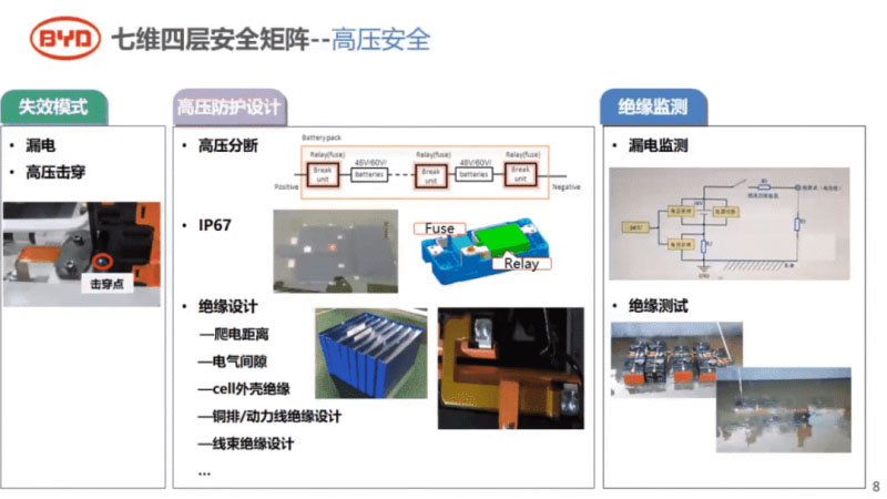 高壓安全方面,失效模式主要為漏電和高壓擊穿。對(duì)此,比亞迪從源頭上進(jìn)行優(yōu)化設(shè)計(jì),首先是高壓分段,維修的時(shí)候,可以通過(guò)一個(gè)主動(dòng)裝置將高壓降下來(lái)。防水層面,比亞迪采用IP67的防水等級(jí),對(duì)進(jìn)水導(dǎo)致的漏電問(wèn)題進(jìn)行屏蔽。