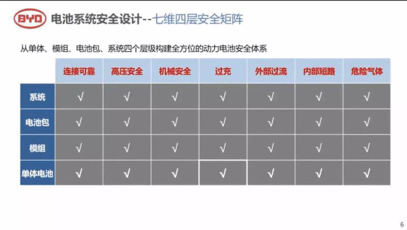 比亞迪考慮安全問(wèn)題時(shí),將電池分為四個(gè)層次,單體電芯、模組、電池包、系統(tǒng);失效模式分為七個(gè)維度,連接可靠、高壓安全、機(jī)械安全、過(guò)充、外部過(guò)流、內(nèi)部短路和危險(xiǎn)氣體。
