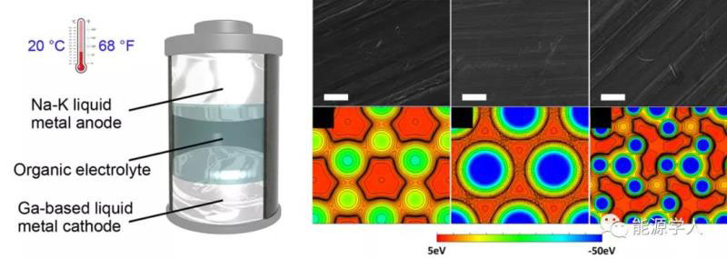 圖1 液態(tài)金屬電池示意圖。集流體SEM圖和相應(yīng)DFT建模靜電勢圖
