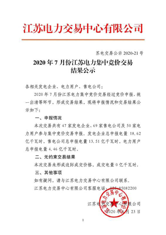 2020年7月份江蘇電力集中競價(jià)交易結(jié)果公示