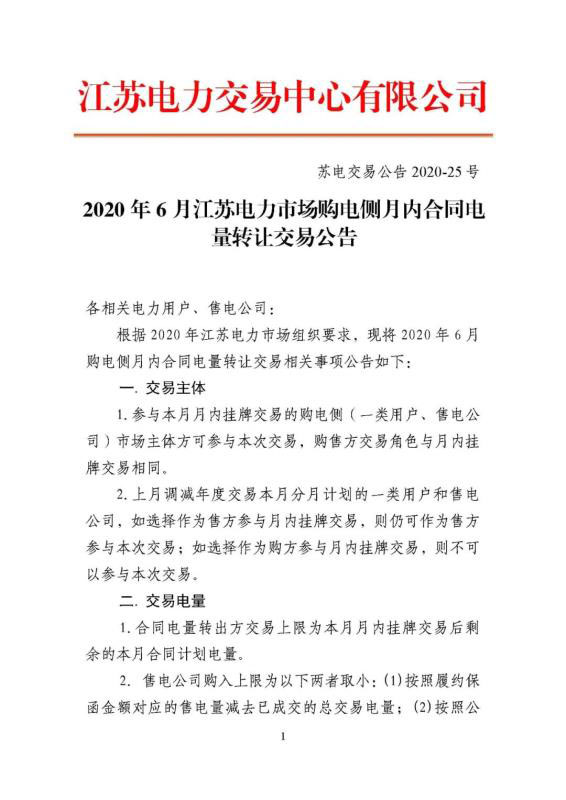 2020年6月江蘇電力市場(chǎng)購(gòu)電側(cè)月內(nèi)合同電量轉(zhuǎn)讓交易公告