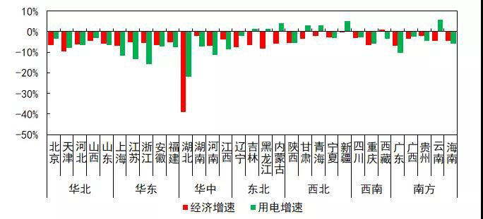 疫情嚴(yán)重地區(qū)、經(jīng)濟(jì)發(fā)達(dá)省份受到明顯波及,經(jīng)濟(jì)和用電出現(xiàn)大幅下滑。一季度,全國31個(gè)省份中30個(gè)省份GDP負(fù)增長,其中湖北下降39.2%,上海、廣東、北京、山東、浙江、江蘇分別下降6.7%、6.7%、6.6%、5.8%、5.6%、5.0%;31個(gè)省份中24個(gè)省份用電量負(fù)增長,主要集中于中東部地區(qū),其中處于疫情中心的湖北增速最低(-22.2%),浙江(-15.8%)、江蘇(-13.2%)、上海(-11.7%)、廣東(-10.4%)、山東(-6.5%)等經(jīng)濟(jì)發(fā)達(dá)地區(qū)用電增速均低于全國平均水平。