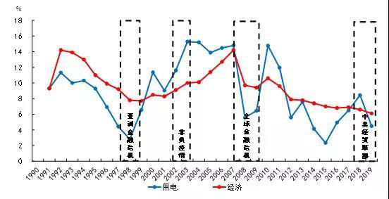 圖1 1990-2019年我國GDP與全社會用電量增速對比