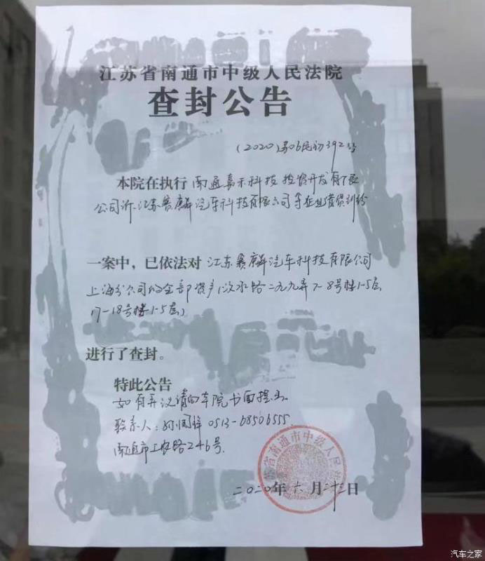 6月23日,江蘇省南通市中級人民法院一紙公告,宣布查封賽麟汽車上海分公司。目前賽麟汽車上海辦公區(qū)已無法進(jìn)出,其在北京、上海等地的部分項(xiàng)目也被迫暫停。