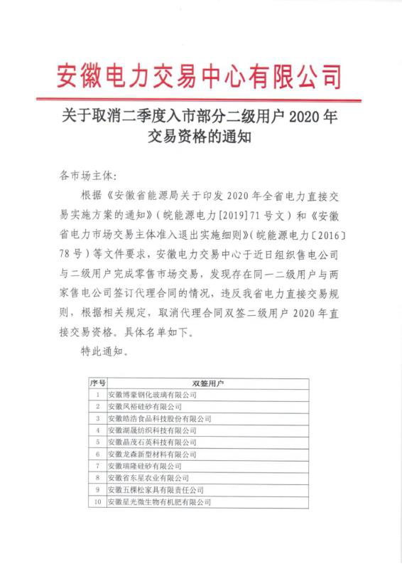 這一行政通知發(fā)布于安徽電力交易中心官方網(wǎng)站,全名《關于取消二季度入市部分二級用戶2020年交易資格的通知》(下文簡稱《取消通知》(見下圖通知全文)。據(jù)悉,這23家用戶被取消今年交易資質的真正原因是“雙簽” ——即與兩家售電公司同時簽訂代理合同,同時提交給交易中心。