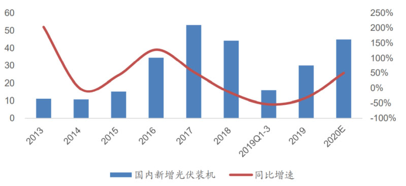另外,近期產(chǎn)業(yè)鏈價(jià)格的下行,也會對國內(nèi)新增裝機(jī)有明顯的促進(jìn)作用。從歷史上來看,新增裝機(jī)和產(chǎn)業(yè)鏈價(jià)格呈現(xiàn)明顯的負(fù)相關(guān)關(guān)系。在報(bào)告《國內(nèi)光伏市場將對需求形成明顯拉動(dòng)》中,我們預(yù)計(jì)2020年國內(nèi)新增光伏裝機(jī)有望達(dá)到甚至超過 45GW,同比增長約50%。