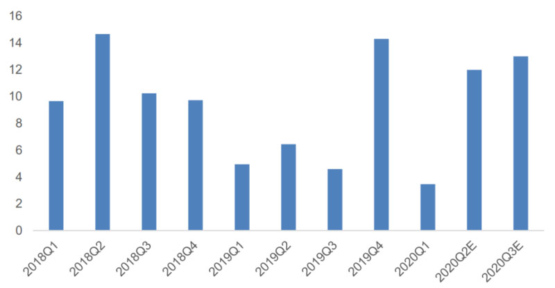 另外,2020年基地項(xiàng)目中的部分項(xiàng)目預(yù)計(jì)也要在三季度進(jìn)行安裝。我們預(yù)計(jì)三季度國內(nèi)新增光伏裝機(jī)仍會超過10GW,環(huán)比持平或略有增長,好于市場預(yù)期。