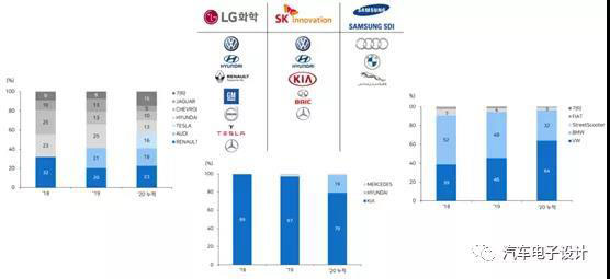 三家韓國公司的增長歸因于,歐洲和美國車企的安裝量的迅速上升: LG Chem:Renault ZOE,特斯拉Model 3(中國制造)和奧迪E- Tron EV 銷量需求 三星SDI:增長歸功于大眾e-Golf ,寶馬330e和帕薩特GTE的強(qiáng)勁銷售 SK Innovation在現(xiàn)代起亞的銷量需求提升和戴姆勒的PHEV銷量需求上升 如下圖所示,這些是海外的基本盤。