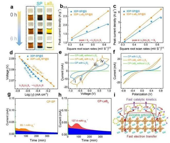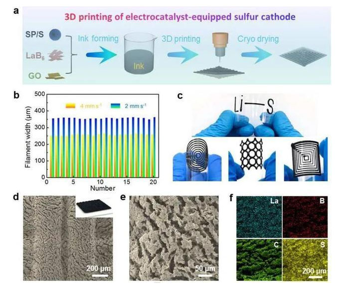 研究人員利用3D打印技術(shù),方便、高效、便捷地構(gòu)筑了高負(fù)載硫正極,該架構(gòu)具有經(jīng)過優(yōu)化的離子/電子傳輸通道和充足的孔隙率,有利于對(duì)多硫化物進(jìn)行高效管理。同時(shí),為了更好地抑制“穿梭效應(yīng)”,研究人員設(shè)計(jì)了包含硫/碳和LaB6電催化劑的混合墨汁,用于打印高性能的硫正極。金屬性LaB6電催化劑可以均勻地分布在3D打印的架構(gòu)內(nèi),自發(fā)地確保有豐富的活性位點(diǎn)用于多硫化物的固定和轉(zhuǎn)化,從而實(shí)現(xiàn)高效率的放電或充電過程。