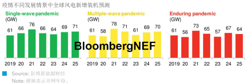 疫情當前,風電行業(yè)表現(xiàn)出了極強的韌性。即使在受疫情沖擊最嚴重的國家,制造業(yè)和建筑業(yè)也已復工復產(chǎn)。就2020年而言,疫情的影響主要是延誤項目工期,而非導致項目被取消;然而,若疫情出現(xiàn)多波反彈,風電行業(yè)可能遭受重大沖擊;若疫情持續(xù)至2021年,審批流程受阻會導致競價缺乏競爭、中標電價提高。嚴重的經(jīng)濟衰退可能會導致較弱的項目無法獲得融資。本篇市場前景報告中,我們探討了三種疫情發(fā)展情景對未來風電新增裝機的影響。