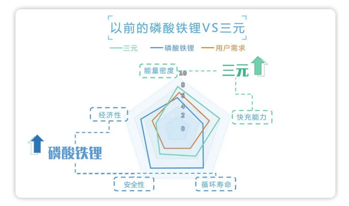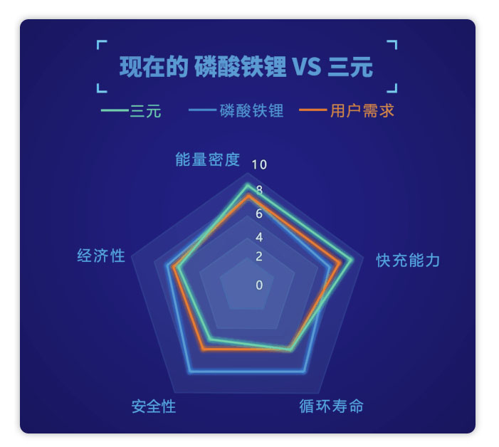 簡單說,三元在能量密度、快充速度方面有優(yōu)勢,磷酸鐵鋰在循環(huán)壽命、安全、經濟性上有優(yōu)勢。