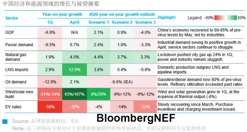 疫情爆發(fā)后,中國(guó)能源市場(chǎng)的需求在2月降至冰點(diǎn),目前似乎出現(xiàn)恢復(fù)態(tài)勢(shì)。除新能源汽車(chē)銷(xiāo)量外,彭博新能源財(cái)經(jīng)追蹤的其他主要指標(biāo)4月均出現(xiàn)同比正增長(zhǎng)。今年下半年市場(chǎng)前景仍取決于國(guó)內(nèi)刺激政策和第二波疫情防控措施的有效性,以及中國(guó)出口市場(chǎng)的恢復(fù)程度。