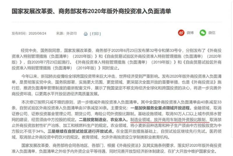 6月24日,國家發(fā)改委、商務(wù)部聯(lián)合發(fā)布《外商投資準(zhǔn)入特別管理措施(負面清單)(2020年版)》和《自由貿(mào)易試驗區(qū)外商投資準(zhǔn)入特別管理措施(負面清單)(2020年版)》,將于2020年7月23日起施行。兩文件再次明確,在制造業(yè)領(lǐng)域放開商用車制造外資股比限制。