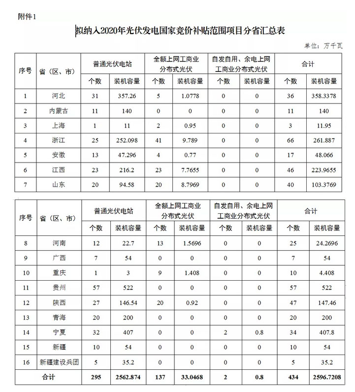 一、遵循公平、公正原則,經(jīng)委托國家可再生能源信息管理中心對各省能源主管部門審核申報(bào)項(xiàng)目進(jìn)行復(fù)核、競價(jià)排序,擬將河北、內(nèi)蒙古等15個省(區(qū)、市)和新疆生產(chǎn)建設(shè)兵團(tuán)的434個項(xiàng)目納入2020年國家競價(jià)補(bǔ)貼范圍,總裝機(jī)容量2596.7208萬千瓦,其中普通光伏電站295個、裝機(jī)容量2562.874萬千瓦,工商業(yè)分布式光伏發(fā)電項(xiàng)目139個、裝機(jī)容量33.8468萬千瓦,具體名單在國家能源局網(wǎng)站上予以公布。各項(xiàng)目按要求建成并網(wǎng)后依政策納入國家競價(jià)補(bǔ)貼范圍,享受國家補(bǔ)貼。鼓勵未納入競價(jià)補(bǔ)貼范圍的申報(bào)項(xiàng)目在企業(yè)自愿的基礎(chǔ)上轉(zhuǎn)為平價(jià)上網(wǎng)項(xiàng)目。